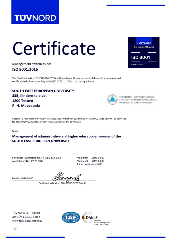 South East European University (SEEU) has achieved another significant success in its journey toward institutional excellence by renewing its certification with the prestigious international ISO 9001:2015 standard from TÜV NORD for another three years.