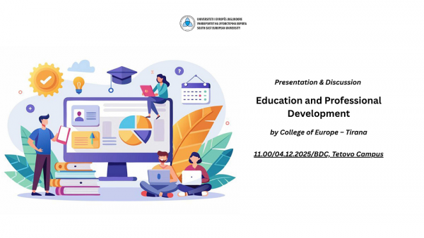We would like to inform you that on December 4, 2025, at 11:00 a.m., in the Conference Room, a presentation and interactive discussion will be held with representatives of an international team in the field of education and professional development from the College of Europe – Tirana, one of the leading institutions in Europe and worldwide in the field of European studies.