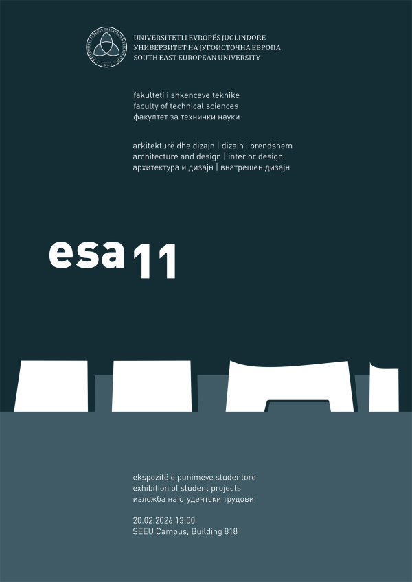 Exhibition of student projects - ESA 11 20 February 2026 Faculty of Technical Science Architecture and Design/ Interior Design 20.02.2026 13:00 SEEU Campus, Building 818 More news Ligjëratë tematike – Sh.T. Denion Mejdani ECONLIT FORUM 3.0 Promovimi i librit "Postieri dashnisë", me autor Elhaid Cufi Education and Professional Development Japan’s Foreign Policy Orange for Awareness! 24th Anniversary