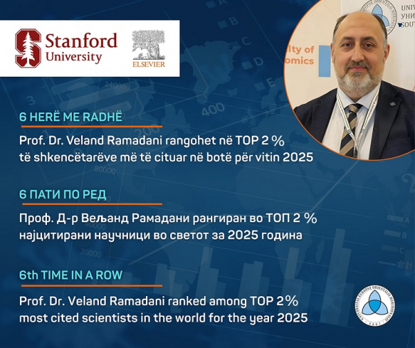 22 September 2025South East European University (SEEU) continues to demonstrate its leading role in academia through the achievements of its professors. For the sixth consecutive time, the Pro-Rector for Research, Planning and Entrepreneurship, Prof. Dr. Veland Ramadani, has been ranked among the world’s Top 2% most cited researchers, according to the prestigious evaluation conducted by Stanford University in collaboration with the scientific publishing house Elsevier.