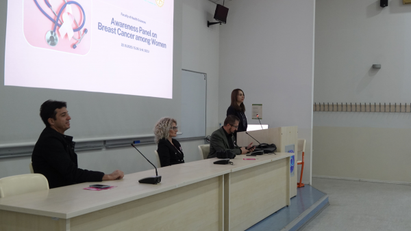 22 October 2025As part of its activities dedicated to promoting women’s health awareness, South East European University, in cooperation with the Faculty of Health Sciences and the Rotary Club of Tetovo, organized a panel discussion on the topic “Awareness of Breast Cancer among Women.” The event aimed to enhance understanding of the importance of early diagnosis and modern approaches to breast cancer treatment.