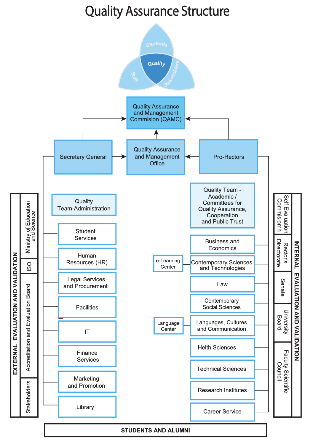 Комисијата за обезбедување квалитет и менаџирање со квалитетот(КОМК)- Комисијата за обезбедување квалитет и менаџирање со квалитетотсе ја води Ректорот а членовите се од Ректорскиот извршен тим. Комисијата ја развива и надгледува имплементацијата на клучните процеси за обезбедување квалитет и менаџирање со квалитетот и известува до Сенатот и до Одборот.
