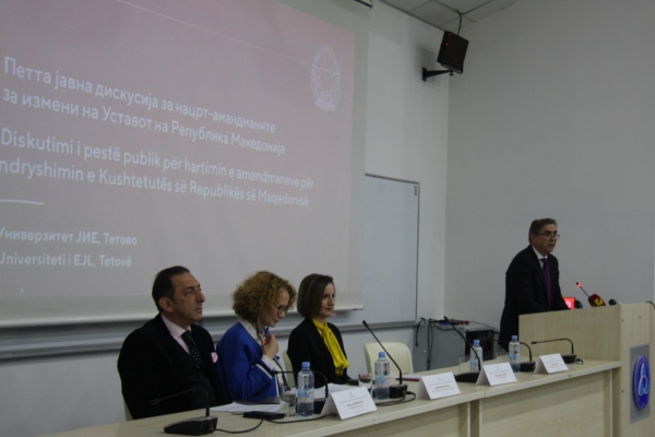 10 dhjetor 2018Përfaqësues të Qeverisë së Maqedonisë, profesorë dhe studentë, të hënën (10.12.2018), në debatin e pestë publik, që u mbajt në Universitetin e Evropës Juglindore në Tetovë, diskutuan për ndryshimet kushtetuese, që parashihen me Marrëveshjen e Prespës.